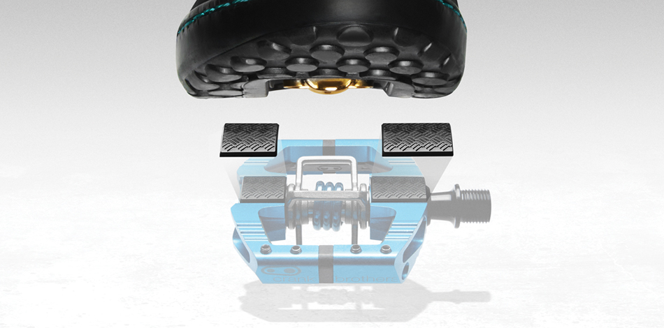 Crank Brothers hat sein erfolgreiches Mallet-Pedal auf Enduro getrimmt. Das Mallet Enduro ist zwölf Prozent kleiner und 50g leichter als die Downhill-Version. Neben dem Klick-Mechanismus fixieren zwei Kontakt-Pads aus Thermoplast den Schuh auf beiden Seiten. Die schwarzen Distanz-Scheiben lassen sich auswechseln (es gibt 1 und 2 Millimeter dicke Pads) und auf die Sohlendicke anpassen. Gerippter Pedalkörper für besseren Halt, wenn Klick-Mechanismus nicht fixiert ist. Zudem halten sechs Pins auf jeder Seite den Schuh in seiner Position auf dem Pedal. 490 Gramm pro Paar.