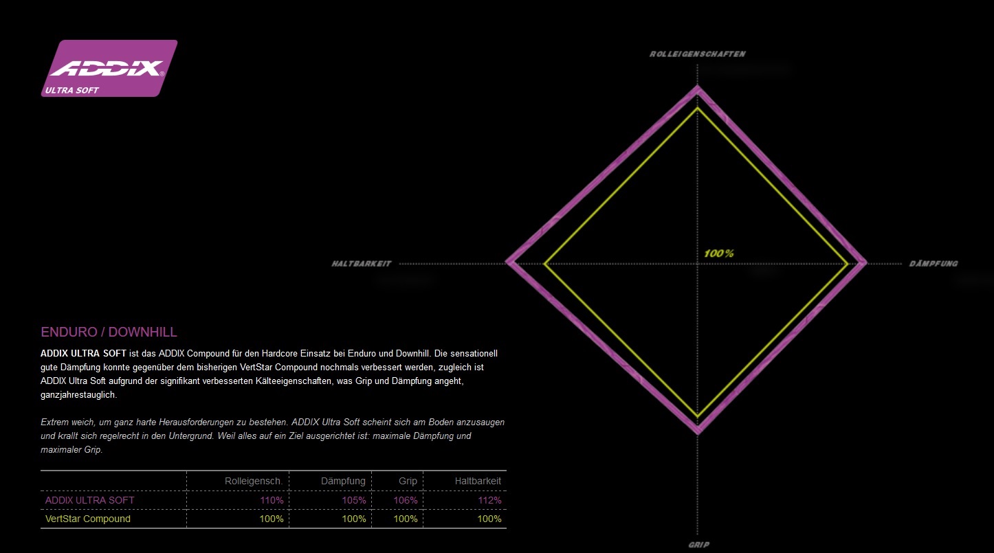 ADDIX ULTRA SOFT ist das ADDIX Compound für den Hardcore Einsatz bei Enduro und Downhill. Die sensationell gute Dämpfung konnte gegenüber dem bisherigen VertStar Compound nochmals verbessert werden, zugleich ist ADDIX Ultra Soft aufgrund der signifikant verbesserten Kälteeigenschaften, was Grip und Dämpfung angeht, ganzjahrestauglich. Extrem weich, um ganz harte Herausforderungen zu bestehen. ADDIX Ultra Soft scheint sich am Boden anzusaugen und krallt sich regelrecht in den Untergrund. Weil alles auf ein Ziel ausgerichtet ist: maximale Dämpfung und maximaler Grip.