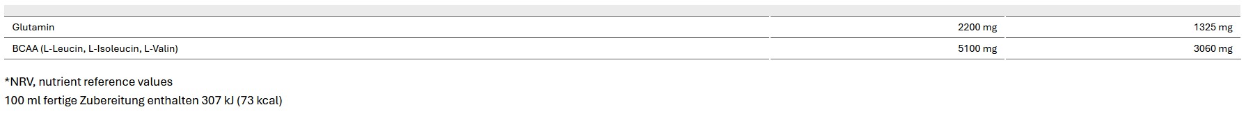 - Die zugesetzten freien Aminosäuren Leucin (1.85 g/100 g) und Glutamin (1.6 g/100 g) werden bei intensivem Sport in erhöhtem Masse benötigt. Leucin dient dabei als Baustoff bei der Proteinsynthese, während Glutamin auch zur Stär kung der Abwehrkräfte beiträgt.