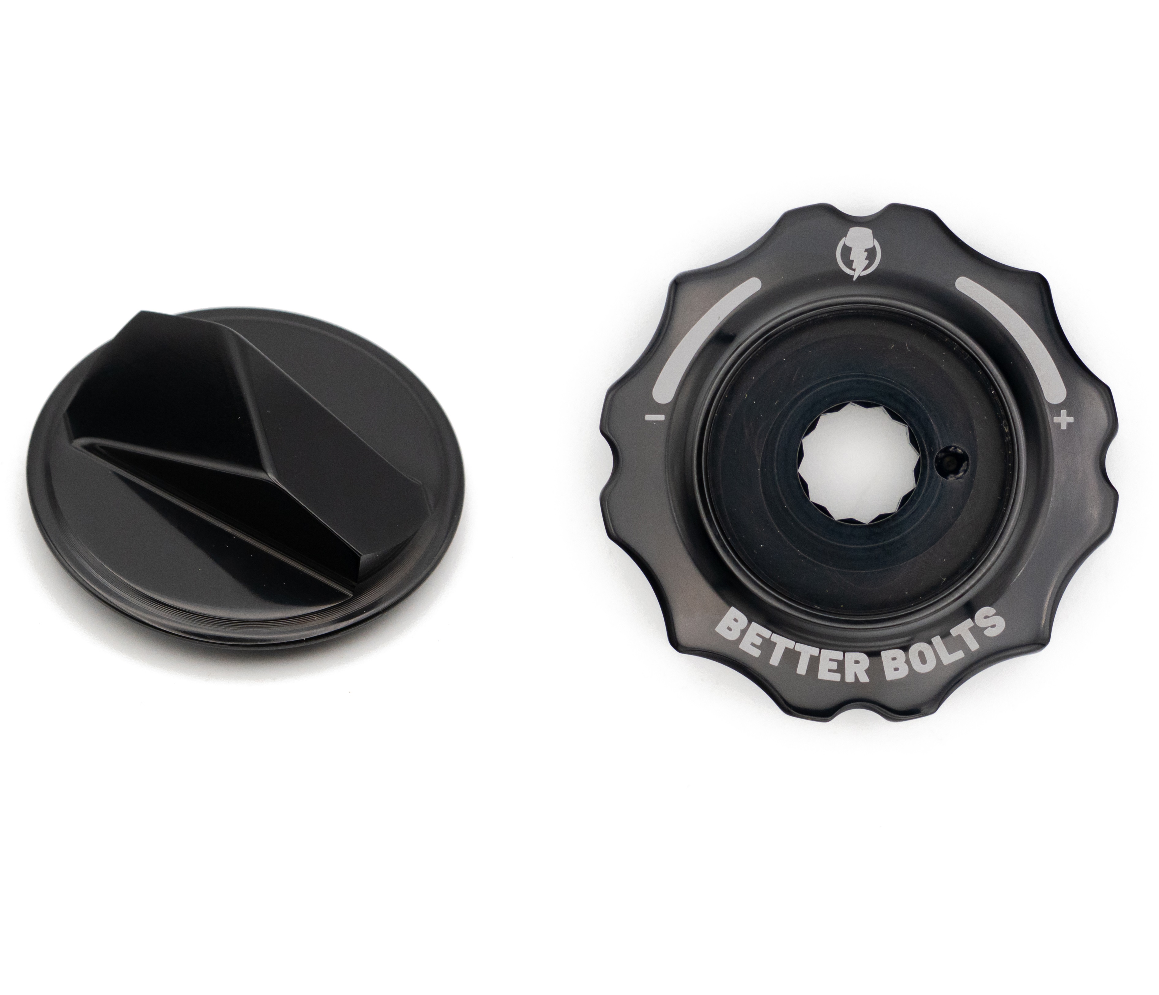 Better Bolts HSC Dial Top Cap und Air Cap passend zu den Fox 36/38/40 Grip 2/Grip X2/Grip X Federgabeln. Wir haben diese Kappen nicht nur entwickelt, um dem Fahrer mehr Möglichkeiten zu geben, das Fahrrad individuell anzupassen, sondern auch, um zusätzliche Funktionalität zu bieten. Die Abdeckung auf der Luftseite wurde speziell entwickelt, um das häufige Problem zu beheben, dass die Kappe beim Nachfüllen von Luft festsitzt. Der Daumenknopf ist so gestaltet, dass er sich nicht mit grossem Drehmoment anziehen lässt, bietet aber eine grosse Oberfläche für guten Halt, wenn der Fahrer die Kappe entfernt. Doch damit nicht genug: Der High-Speed-Compression-Drehknopf (HSC) wurde mit engeren Toleranzen neu gestaltet, was ein deutlich spürbareres Klicken beim Einstellen der Federung bietet und es dem Fahrer ermöglicht, die Einstellung seiner Gabel präziser vorzunehmen. Im Lieferumfang dabei ist auch die Feder sowie Kugel für das HSC Dial Top Cap, sollten diese während der Montage verloren gehen, kannst du die serienmässigen Teile problemlos verwenden.