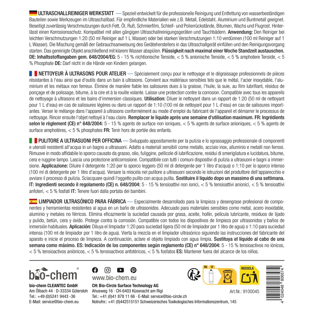 - Die bio-chem Reinigungslösung ist universell für alle Ultraschallbäder einsetzbar – auch bei empfindlichen Aluminiumoberflächen.