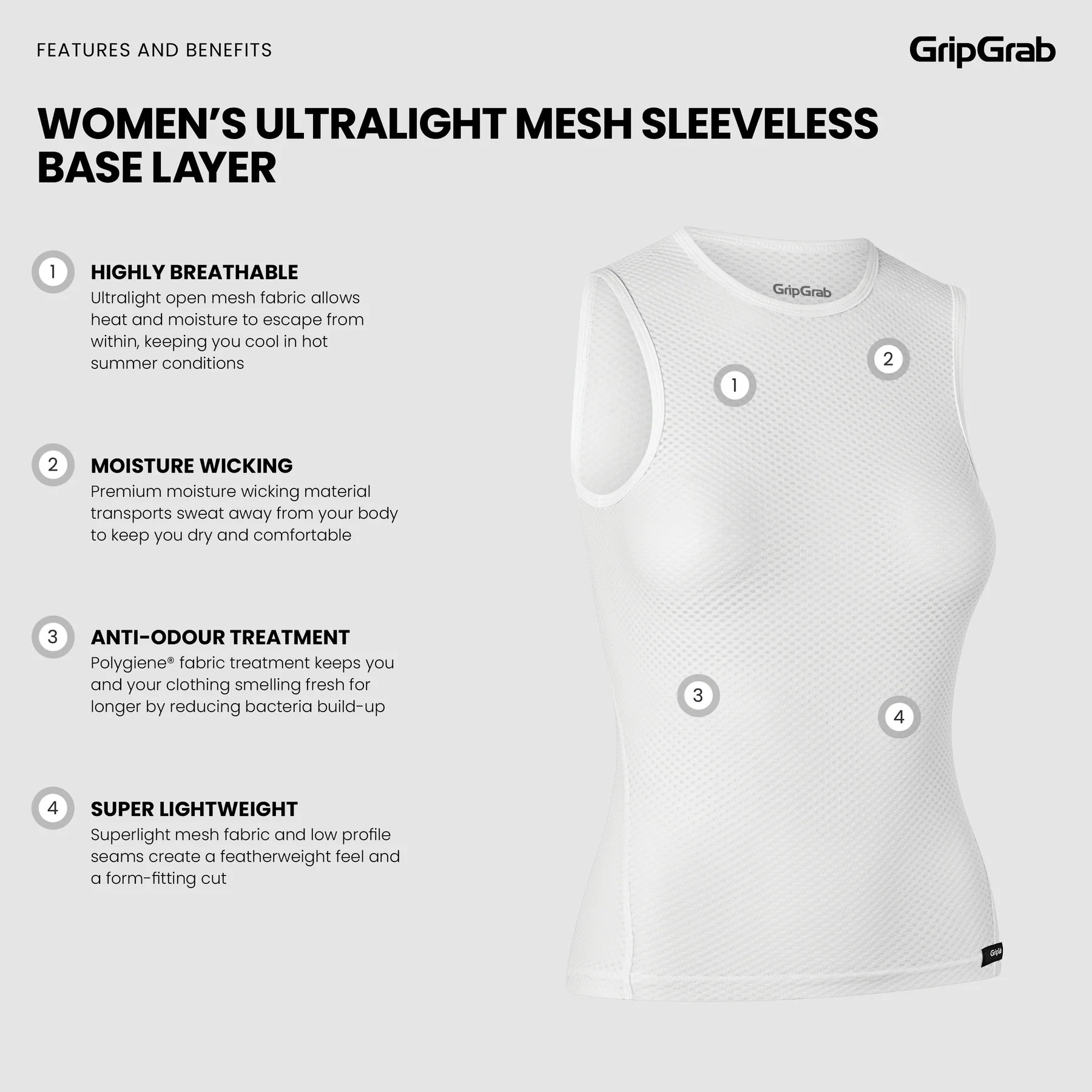 Das ärmellose GripGrab Ultralight Mesh Unterhemd ist das Must-have für Fahrten an heißen Sommertagen. Das offenmaschige Material ermöglicht deiner Haut zu atmen, während zugleich Feuchtigkeit von deinem Körper abgeleitet wird, damit du trocken und bequem bleibst. Das minimale Volumen und die minimalen Nähte sorgen für maximale Atmungsaktivität; die Basis für hervorragenden Komfort und ausgezeichnete Leistung, wenn du in der sommerlichen Hitze Gas gibst.