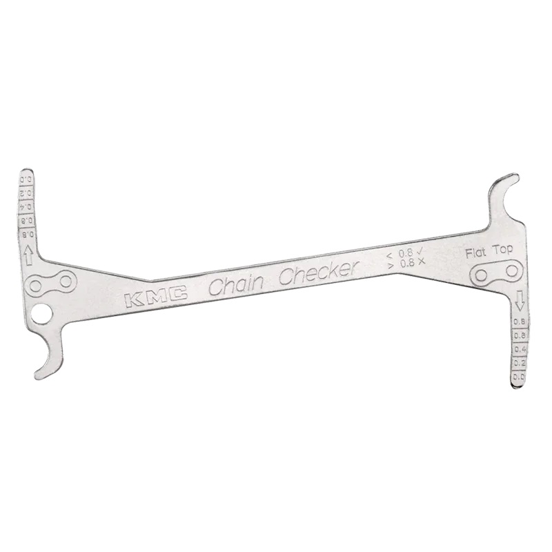 Die KMC Easy Chain Checker ist eine Kettenmesslehre zur einfachen und schnellen Überprüfung des Verschleisses, auch kompatibel mit Flat Top Ketten. Auch wenn eine Schaltungskette noch voll funktionstüchtig ist, passt sie ab einer bestimmten Verschleissgrösse nicht mehr genau mit den Ritzeln überein. Wird die Kette jetzt nicht gegen eine neue ausgetauscht, arbeiten sich Ritzel und Kettenblätter vorzeitig ein und müssen dann beim Kettenwechsel ebenfalls erneuert werden.