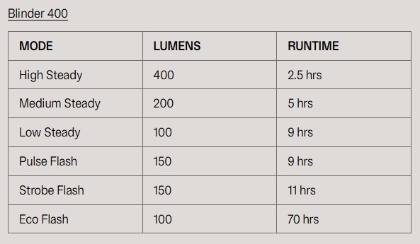 Vorne verfügt das Blinder 400 über ein kompaktes und dennoch robustes Design mit einer Leistung von 400 Lumen und einem klaren, tageslichtfarbenen Lichtstrahl, der die Augen bei Nachtfahrten weniger belastet. Sein fokussierter 18°-Lichtstrahl durchdringt die Dunkelheit mit Präzision, während ein robustes Gehäuse aus Verbundnylon und ein 1850-mAh-Akku für lang anhaltende Leistung sorgen.