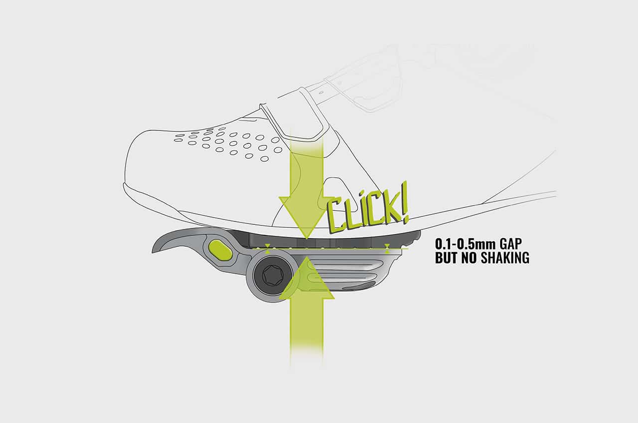 Der Schuh wird je nach gewählter Magnetstärke mit bis zu 18 kg Zugraft (150er Magnet) magnetisch am Pedal gehalten. Die Zugkraft wirkt vor allem vertikal und ein seitliches Ablösen vom Pedal ist nahezu ohne spürbaren Widerstand möglich. Aber auch ein schnelles und einfaches Ablösen in kritischen Situationen direkt nach oben ist kein Problem.