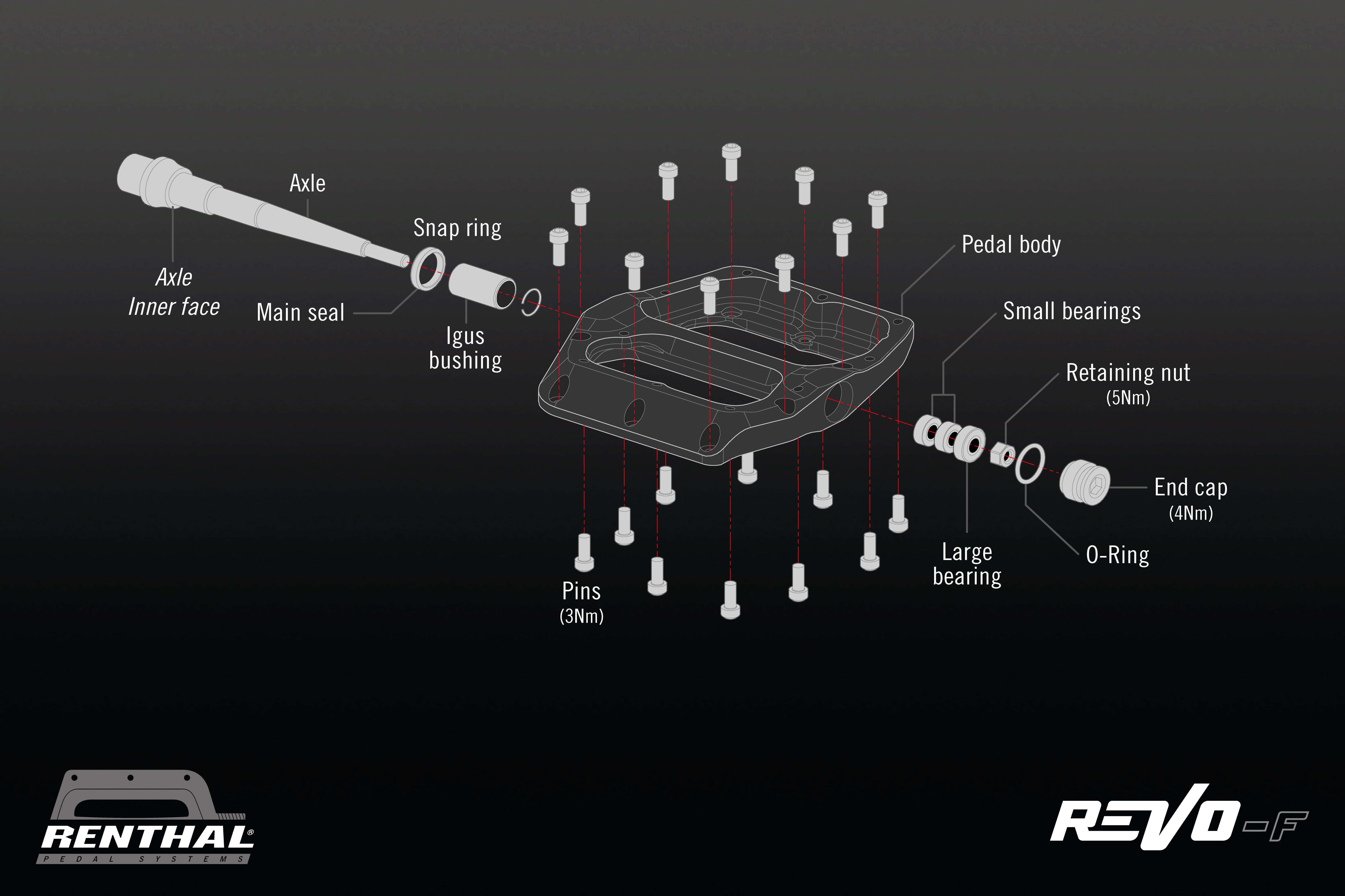 Im Inneren dreht sich das Revo-F auf einer extrabreiten Igus-Buchse, die mit einer Vollkontakt-Abstreifdichtung abgedichtet ist. Aussen befinden sich drei Patronenlager. Zwei kleinere Lager und ein grösseres, Lager an der äussersten Stelle, abgedichtet mit einem Endkappen-O-Ring. Die Haltbarkeit der Lager wird durch die durchgehende Achse zusätzlich erhöht. Durch die Montage der Lager am äusseren Rand des Pedals werden sie optimal gestützt und vor Beschädigungen durch Steinschläge geschützt.