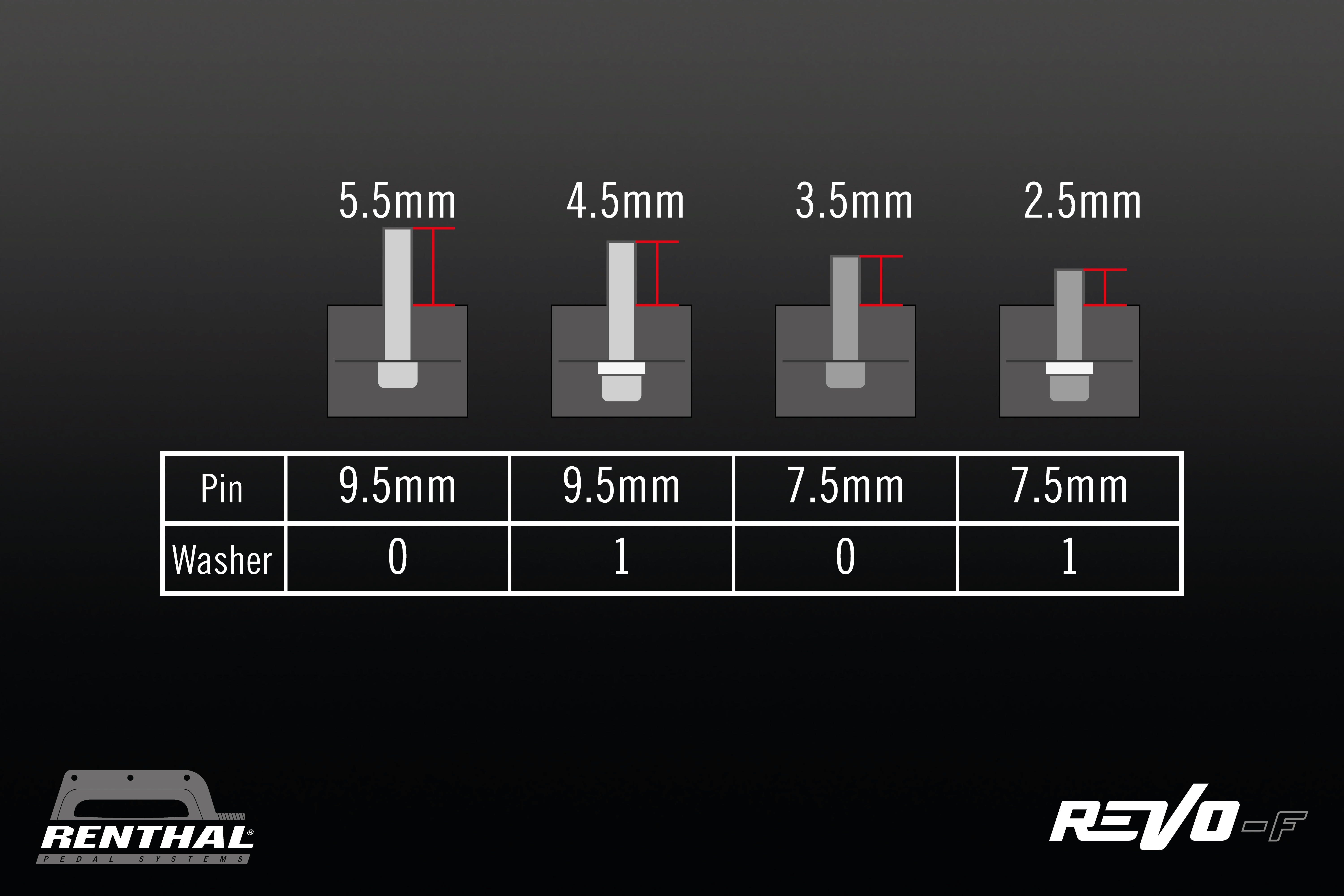 Revo-F-Pedale sind werkseitig mit zehn 5.55 mm hohen Pins pro Seite ausgestattet. Im Lieferumfang der Pedale sind weitere vierzig Pins und vierzig Unterlegscheiben enthalten. Mit einer Kombination aus diesen kann die Höhe von 5,5 mm auf entweder 4.5 mm, 3.5 mm oder 2.5 mm eingestellt werden, was sie zu einem der am besten einstellbaren Pedale auf dem Markt macht. Darüber hinaus sind alle Stifte durchgeschraubt und können daher bei Beschädigungen durch Stösse leicht entfernt werden.