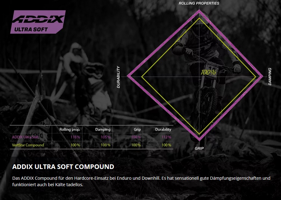 ADDIX ULTRA SOFT ist das ADDIX Compound für den Hardcore Einsatz bei Enduro und Downhill. Die sensationell gute Dämpfung konnte gegenüber dem bisherigen VertStar Compound nochmals verbessert werden, zugleich ist ADDIX Ultra Soft aufgrund der signifikant verbesserten Kälteeigenschaften, was Grip und Dämpfung angeht, ganzjahrestauglich. Extrem weich, um ganz harte Herausforderungen zu bestehen. ADDIX Ultra Soft scheint sich am Boden anzusaugen und krallt sich regelrecht in den Untergrund. Weil alles auf ein Ziel ausgerichtet ist: maximale Dämpfung und maximaler Grip.