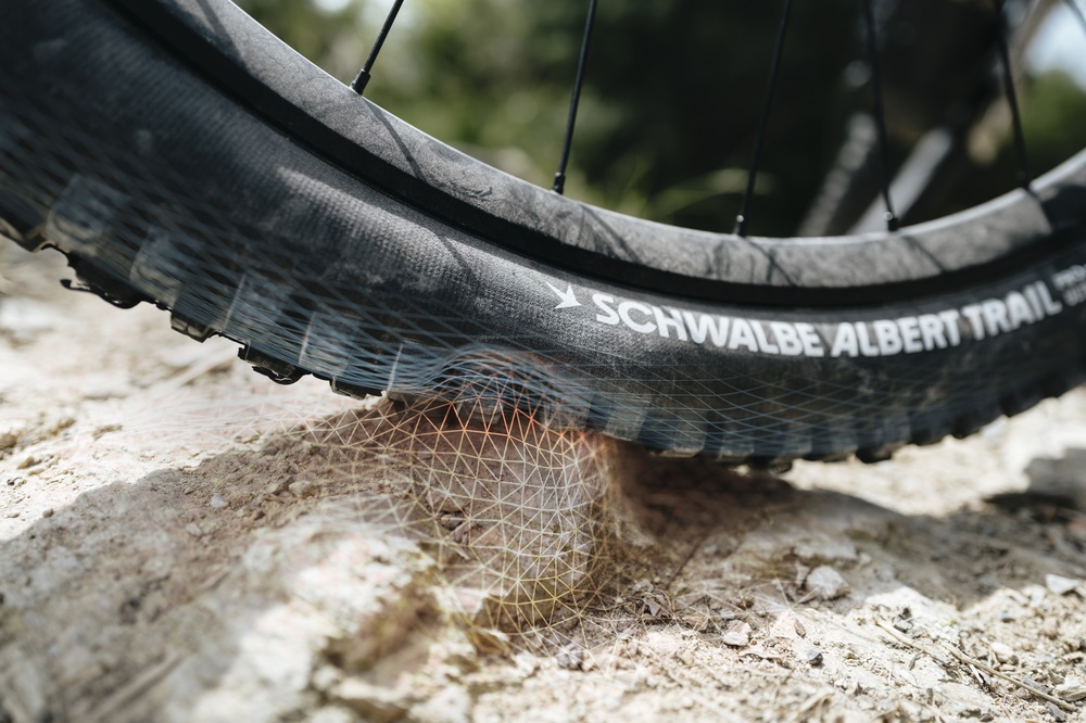 Bei der Entwicklung von Albert haben Schwalbes Entwickler die Erkenntnisse aus der Entwicklung des Tacky Chan genutzt. Die Grundfrage: Wie muss ein Reifen aussehen, der mir in jeder Situation viel Sicherheit gibt? Die Schulterstollen vom Tacky Chan wurden übernommen und sorgen für verlängerte Bremskanten, Haltbarkeit und gute Übertragbarkeit der Seitenkräfte. Insgesamt ist der Reifen geschlossener und runder. Es gibt nur zwei verschiedene Stollentypen. Carl Kämper, Product Management & Development MTB: „Wir haben viel mehr Gummi am Boden und mehrere Stollen, die ständig im Kontakt mit dem Untergrund sind. In Verbindung mit der größeren Auflagefläche der Radialreifen gibt dir das außergewöhnlich viel Kontrolle beim Fahren, egal ob beim Bremsen oder Beschleunigen. Der Reifen passt sich extrem gut an.“