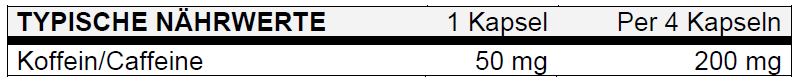 Enthält Koffein. Für Kinder und Schwangere nicht empfohlen. Maximal empfohlene Tagesration von 4 Kapseln (200 mg Koffein)* nicht überschreiten. Ausserhalb der Reichweite von kleinen Kindern lagern. Nahrungsergänzungsmittel sind kein Ersatz für eine abwechslungsreiche und ausgewogene Ernährung und eine gesunde Lebensweise.