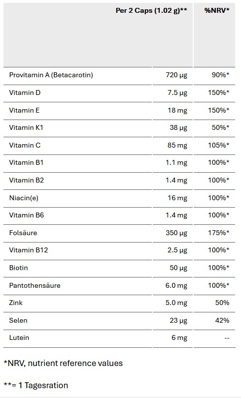 Vitaminmischung (L-Ascorbinsäure, Nicotinamid, DL-alpha-Tocopherylacetat, Calcium-D-pantothenat, Beta-Carotin, Riboflavin, Pyridoxinhydrochlorid, Thiaminmononitrat, Pteroylmonoglutaminsäure, D-Biotin, Phytomenadion, Cholecalciferol, Cyanocobalamin), Trennmittel (mikrokristalline Cellulose, Siliciumdioxid), Kapselhülle, Hydroxypropylmethylcellulose, Gemüse- und Fruchtextrakte 13.2%, (Traubenkern, Grüntee, Trauben, Tomaten, Karotten, Heidelbeeren, Broccoli, Kohl, Zwiebeln, Knoblauch, Grapefruit, Spargel, Papayas, Ananas, Erdbeere, Apfel, Aprikose, Kirschen, Orangen, schwarze Johannisbeeren, Oliven, Gurken), Luteinester, Zinklactat, Selenhefe