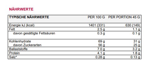 Geeignet zur Energiebereitstellung vor und während der Aktivität, je nach Intensität und Verträglichkeit. Auch als fruchtig-getreidehaltige Zwischenmahlzeit im Alltag geeignet.