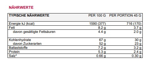 Geeignet zur Energiebereitstellung vor und während der Aktivität, je nach Intensität und Verträglichkeit. Auch als fruchtig-getreidehaltige Zwischenmahlzeit im Alltag geeignet.