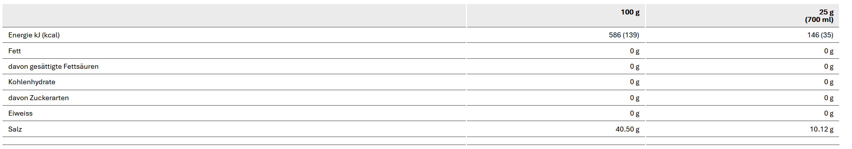 Natriumcitrat 45%, Füllstoff Polydextrose Natriumbikarbonat 24%, Aromen, Süssungsmittel Steviolglykoside