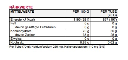 ½ Tube unmittelbar vor Leistungsbeginn anschliessend pro Stunde 1 Tube (ca. 50 g KH) einnehmen. Genügend Flüssigkeit dazu trinken. Dosis bei Leistungen von mehr als 3 Stunden je nach Bedarf steigern.