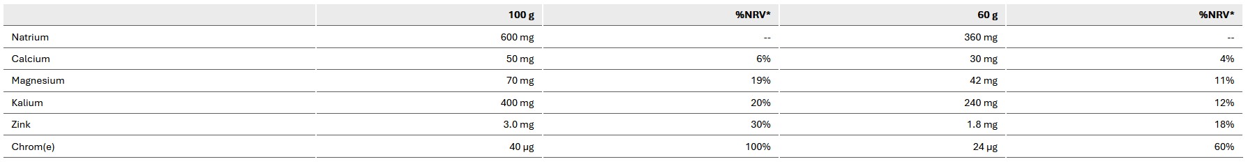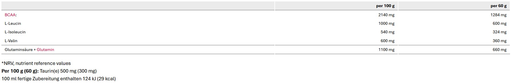 Glucose, Maltodextrin, Saccharose, Wachsmaisstärkehydrolisat (Vitargo®) 12%, Proteinhydrolysate 12% (Molke, Casein), Isomaltulose*, Trehalose**, Mineralstoffe (Natrium-, Kaliumcitrat, Magnesiumlactat, chromhaltige Nährhefe, Zinklactat), Aromen, Taurin 0.5%, Schwarztee-Extrakt, Vitamine (Ascorbinsäure, Nicotinamid, alpha-Tocopherylacetat, Calciumpantothenat, Pyridoxinhydrochlorid, Riboflavin, Thiaminmononitrat, Folsäure, Biotin, Cyanocobalamin), Farbstoff Zuckerkulör. *Quelle von Glucose und Fructose **Glucosequelle