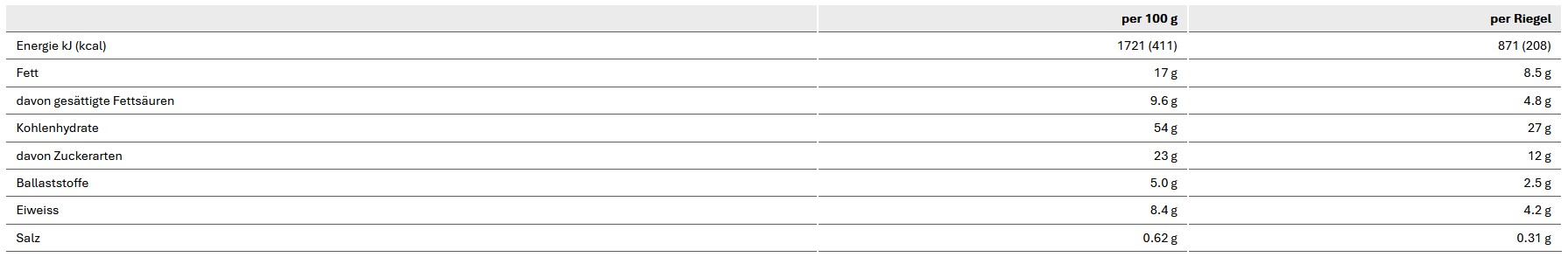 Haferflocken 44%, Vollmilchpulver, Butter, Glucosesirup, Karamellstücke 4.2% (Zucker, Glucosesirup, Rahm, Magermilchpulver, Salz, Dextrose, Aroma), Rohrohrzuckersirup, Honig, Zucker, Karamelzucker, Aromen, Feuchthaltemittel Glycerin, Meersalz, Emulgator Sojalecithin