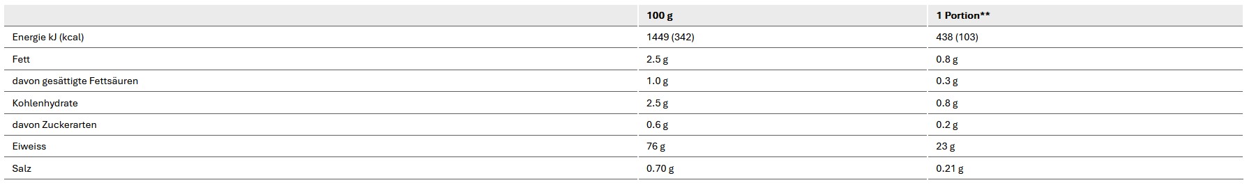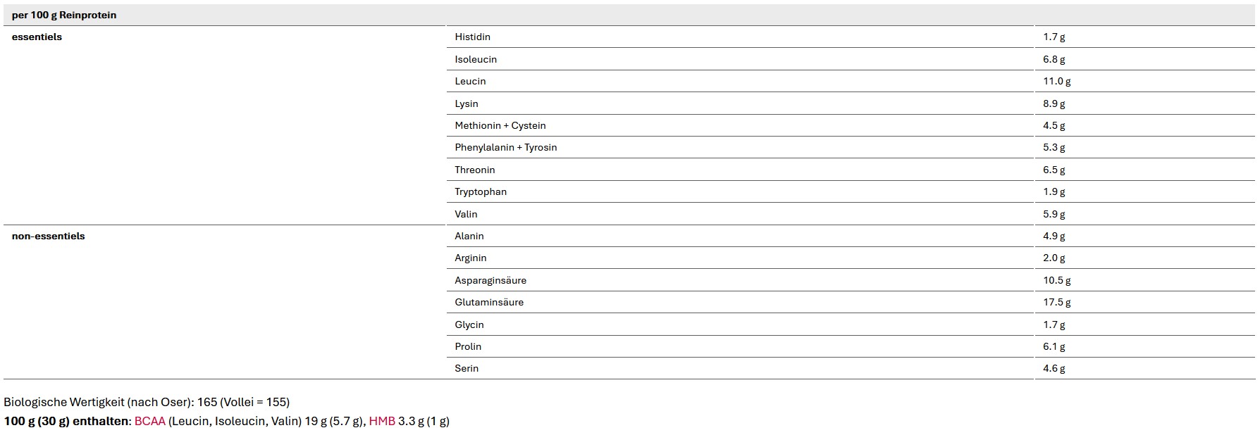 Molkeprotein-Isolat (Cross Flow Filtration, teilhydrolisiert) 81% (Irland), Kakao stark entölt 6%, Molkeproteinhydrolisat* (mit 50% BCAA in Peptidform) 4%, β-Hydroxy-β-methylbutyrat-Calcium (HMB) 4%, Aromen, Vitamine (Ascorbinsäure, Nicotinamid, alpha-Tocopherylacetat, Calciumpantothenat, Pyridoxinhydrochlorid, Riboflavin, Thiaminmononitrat, Folsäure, Biotin, Cyanocobalamin), Mineralsalze (Magnesiumcarbonat, Zinklactat), Verdickungsmittel (Guarkernmehl, Xanthan), Emulgator Sonnenblumenlecithin, Lactase (Enzym), Süssungsmittel Sucralose.