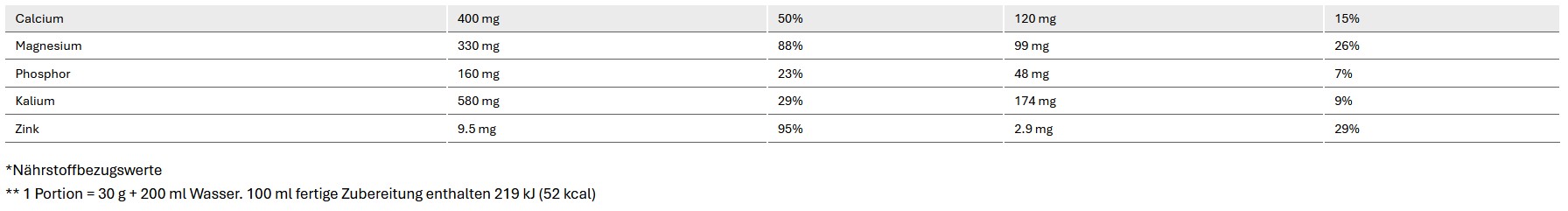 3 Messlöffel (30 g) in ca. 200 ml Wasser auflösen. Bei Zubereitung mit Milch kann die Pulvermenge auf ca. 25 g (2.5 Messlöffel) reduziert werden. Im Shaker oder Mixer zubereiten.
