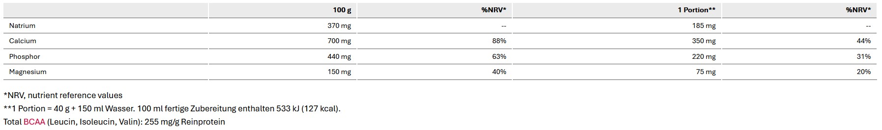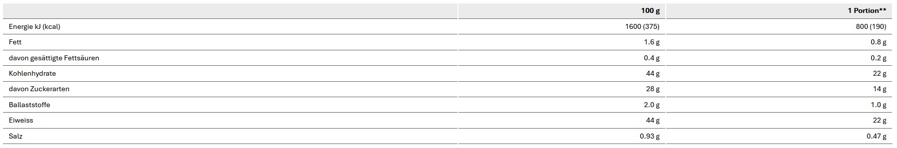 Proteinpulver 50% (Protein-Isolate aus Cross Flow Filtration [Molke, Milch], mizelläres Casein, Proteinhydrolysate [Molke], bovines Colostrum 3%), Saccharose, Mangofruchtpulver (mit Maltodextrin) 9%, Stärkehydrolysate 6% (Wachsmais, Reis), Aminosäuren 3.2% (L-Leucin, L-Glutamin), Säuerungsmittel (Citronen-,Apfelsäure), Aromen, Emulgator Sonnenblumenlecithin, färbender Paprikaextrakt, Vitamine (Ascorbinsäure, Nicotinamid, alpha-Tocopherylacetat, Calciumpantothenat, Pyridoxinhydrochlorid, Riboflavin, Thiaminmononitrat, Folsäure, Biotin, Cyanocobalamin)