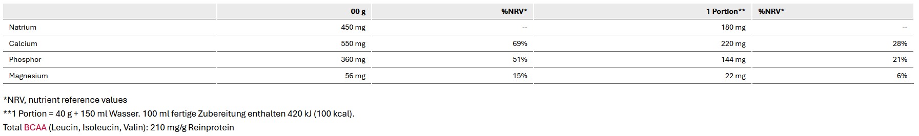 Proteinpulver 57% (Protein-Isolate aus Cross Flow Filtration [Molke, Milch], mizelläres Casein, Eialbumin, Proteinhydrolysate [Casein, Molke]), Saccharose, Fructose, Stärkehydrolysate 7% (Wachsmais, Reis), Aminosäuren 4% (L-Leucin, L-Glutamin), Aromen, Mineralsalze (Natriumcitrat, Magnesiumlactat), Vanille-Extrakt 1%, Karamellpulver, Vitamine (Ascorbinsäure, Nicotinamid, alpha-Tocopherylacetat, Calciumpantothenat, Pyridoxinhydrochlorid, Riboflavin, Thiaminmononitrat, Folsäure, Biotin, Cyanocobalamin)
