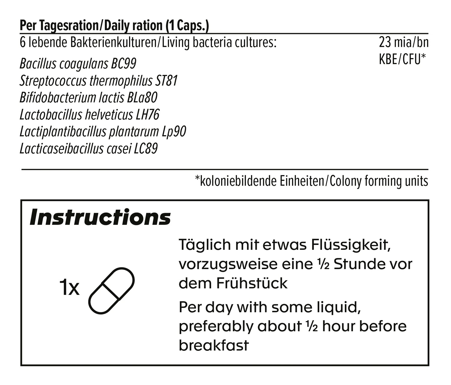 Kapselhülle (E464, vegan), 6 lebende Bakterienkulturen (23 mia KBE*/Tagesration), Trennmittel (mikrokristalline Cellulose, Kieselsäure)