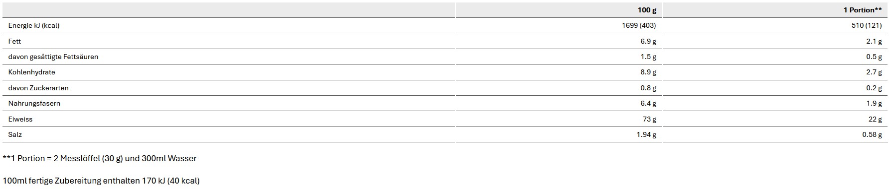 2 Messlöffel (30 g) + ca. 300 ml Wasser im Shaker. Nach Belieben zusätzlich mit Früchten, Fruchtsaft oder Kakaopulver verfeinern.
