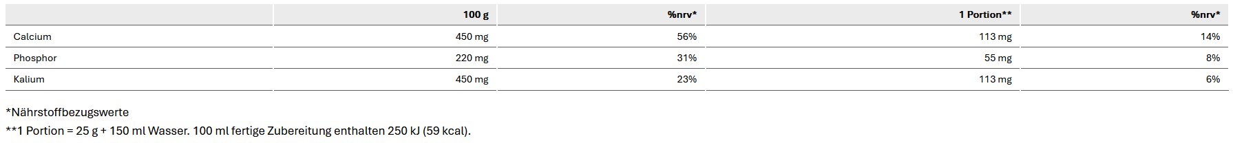 25 g Pulver in ca. 150 ml kaltes Wasser oder 20 g Pulver in ca. 200 ml Milch einrühren und schütteln.