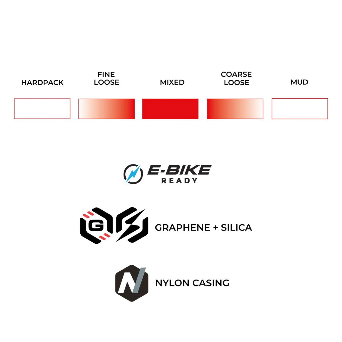 Optimiert für schnelle und technische Gelände, bietet diese rennfertige Mischungsformel eine Balance zwischen Geschwindigkeit und Kontrolle. Die Synergie von Graphen und Silica verbessert den Grip und erhält gleichzeitig die Rollgeschwindigkeit und Haltbarkeit. Entwickelt für Cross-Country-Rennfahrer, die in jedem Abschnitt – Anstiege, Abfahrten und Sprints – Höchstleistungen verlangen. Geschwindigkeit und Grip, genau dort, wo XC-Rennfahrer es am meisten benötigen.