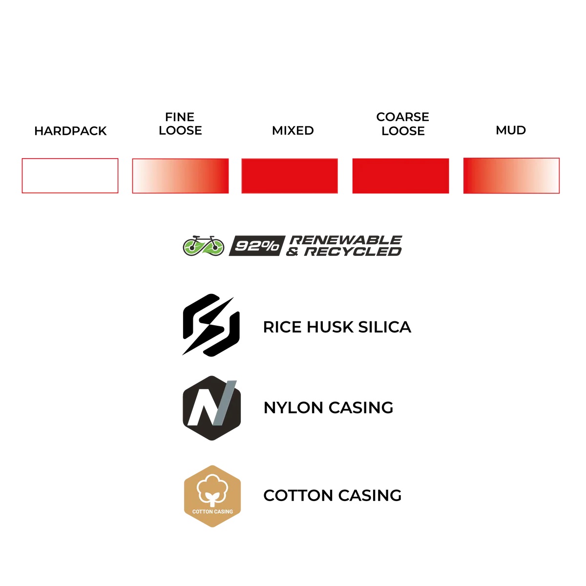 Eine speziell für Gravel-Rennen entwickelte Mischung der nächsten Generation, die auf unterschiedlichem Terrain aussergewöhnliche Geschwindigkeit und Haftung bietet. Zu den erneuerbaren und recycelten Inhaltsstoffen gehören Fair-Rubber-zertifizierter Naturkautschuk, Sojaöl und Siliziumdioxid aus Reisschalenasche.